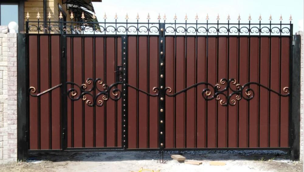 Каркас ворот выполнен из профильной трубы 50х25 мм. Вертикальные прутья- профильная труба 15х15 мм. Профильный лист (С-15А). Ворота украшает ряд литых пик. По верху ворот проходит ряд кованых элементов, выполненных из профильной трубы 15х15мм с прокатанными бортиками. Рисунок на воротах также выполнен из профильной трубы 15х15мм с прокатанными бортиками. Все элементы в рисунке и пики на воротах покрыты декоративной патиной «Церта-Пласт». (Есть дополнительные фото)