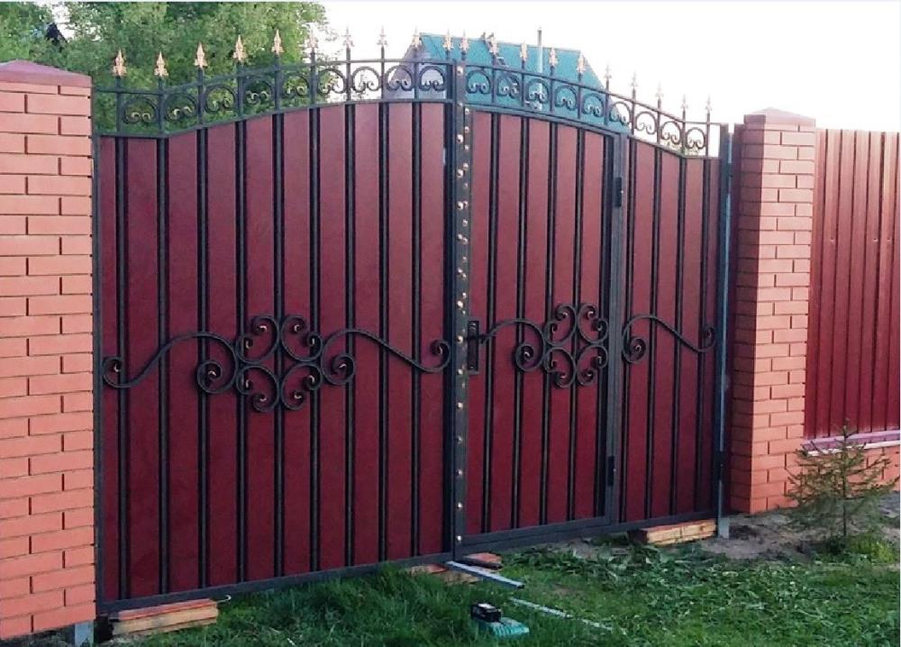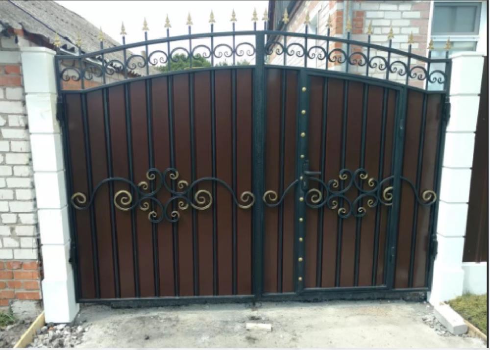 Каркас ворот выполнен из профильной трубы 50х25 мм. Вертикальные прутья- профильная труба 15х15 мм. Профильный лист (С-15А). Ворота украшает ряд литых пик. По верху ворот проходит ряд кованых элементов, выполненных из профильной трубы 15х15мм с прокатанными бортиками. Рисунок на воротах также выполнен из профильной трубы 15х15мм с прокатанными бортиками. Использована декоративная кованая полоса. Все элементы в рисунке и пики на воротах покрыты декоративной патиной «Церта-Пласт». (Есть дополнительные фото)
