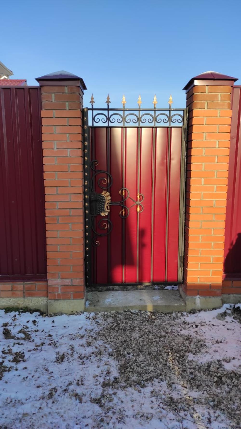 Каркас ворот и калитки выполнен из профильной трубы 50х25 мм. Вертикальные прутья- профильная труба 15х15 мм. Профильный лист (С-15А). Ворота и калитку украшает ряд литых пик. По верху изделий проходят кованые элементы, выполненные из профильной трубы 15х15мм с прокатанными бортиками. Рисунок на воротах и калитке также выполнен из профильной трубы 15х15мм с прокатанными бортиками. Использованы объемные штампованные элементы, декоративная кованая полоса. Все элементы в рисунке и пики на воротах и калитке покрыты декоративной патиной «Церта-Пласт». (Есть дополнительные фото)