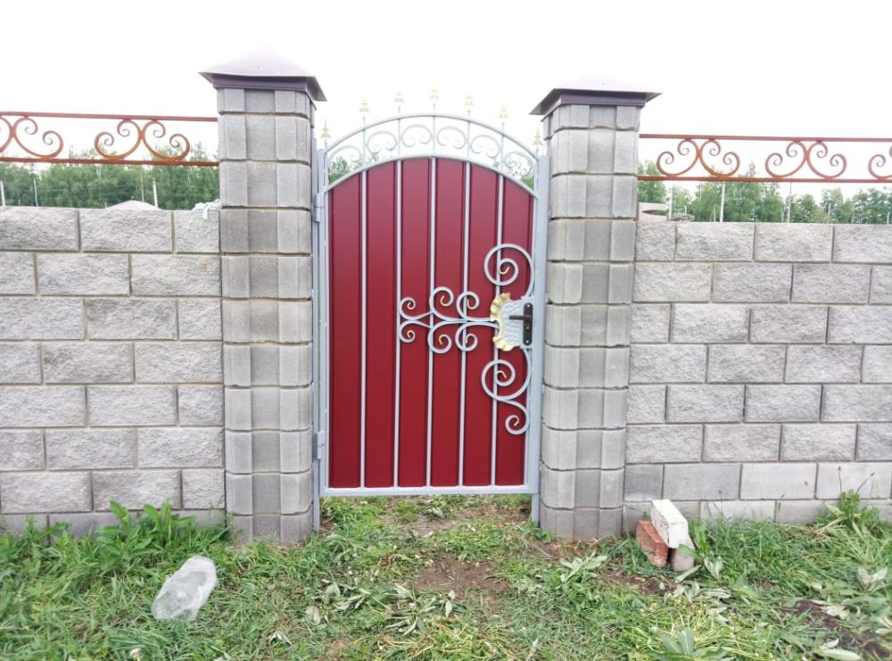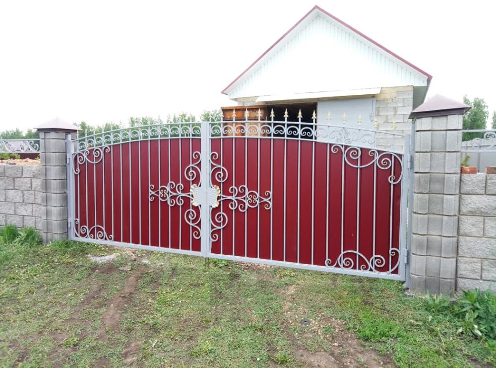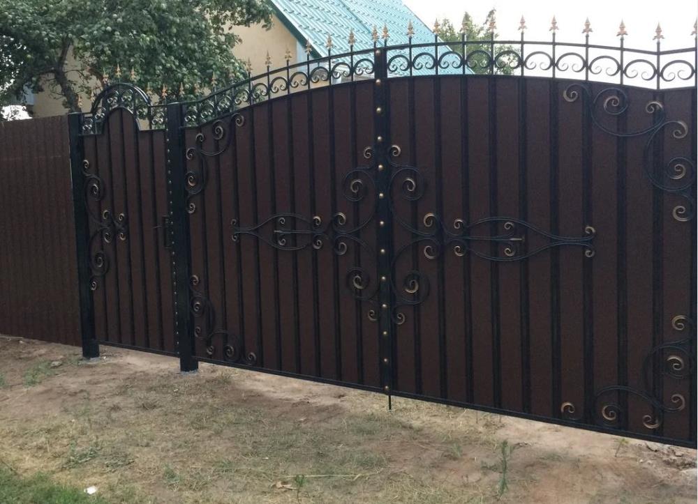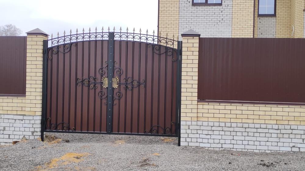 Каркас ворот и калитки выполнен из профильной трубы 50х25 мм. Вертикальные прутья- профильная труба 15х15 мм. Профильный лист (С-15А). Ворота и калитку украшает ряд литых пик. По верху изделий проходят кованые элементы, выполненные из профильной трубы 15х15мм с прокатанными бортиками. Рисунок на воротах и калитке также выполнен из профильной трубы 15х15мм с прокатанными бортиками. Использованы объемные штампованные элементы, декоративная кованая полоса. Все элементы в рисунке и пики на воротах и калитке покрыты декоративной патиной «Церта-Пласт». (Есть дополнительные фото)