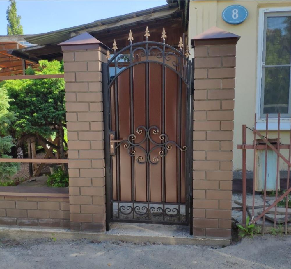Все детали собранные для этих ворот обладают прокатанные бортики, которые выглядят безмерно изящно на изделии в сочетании с окрашиванием патиной и выделения законцовок элементов и литых пик.