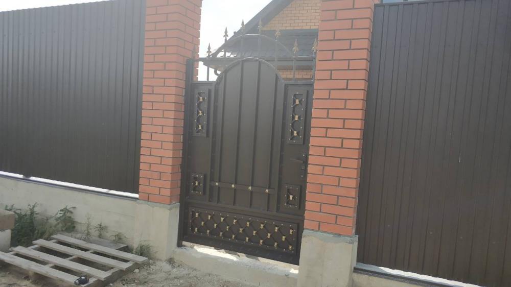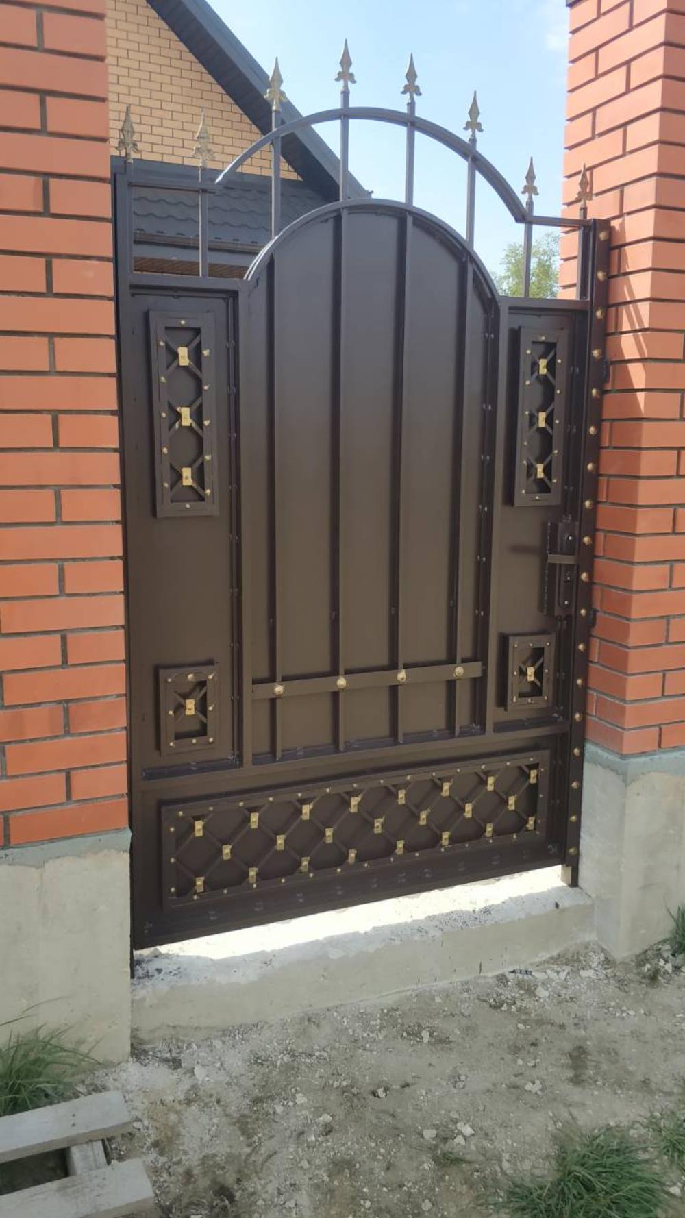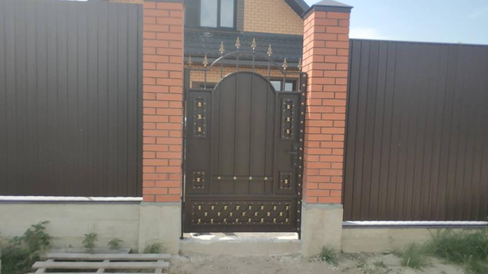 Каркас ворот и калитки выполнен из профильной трубы 50х25мм. Вертикальные прутья-профильная труба 15х15мм. Лист 2мм, полоса. Ворота и калитку украшает ряд литых пик. Использована декоративная кованая полоса, штампованные кованые элементы-прямоугольные оковки. Все элементы в рисунке и пики на воротах и калитке покрыты декоративной патиной «Церта-Пласт». (Есть дополнительные фото)