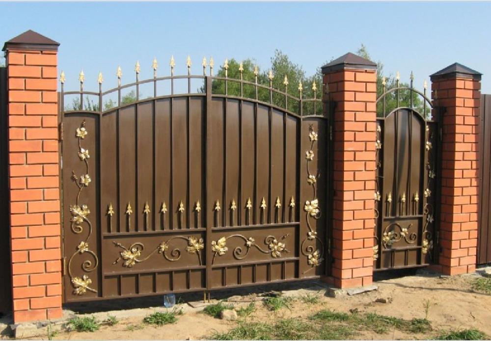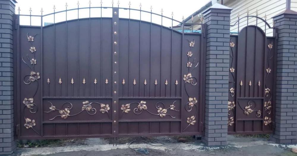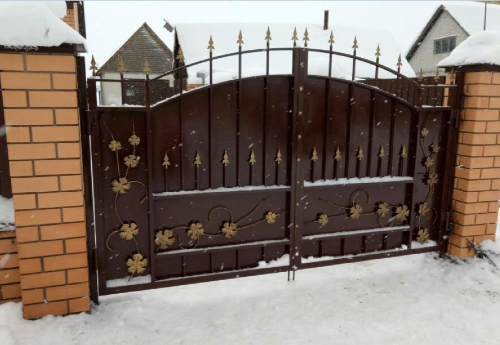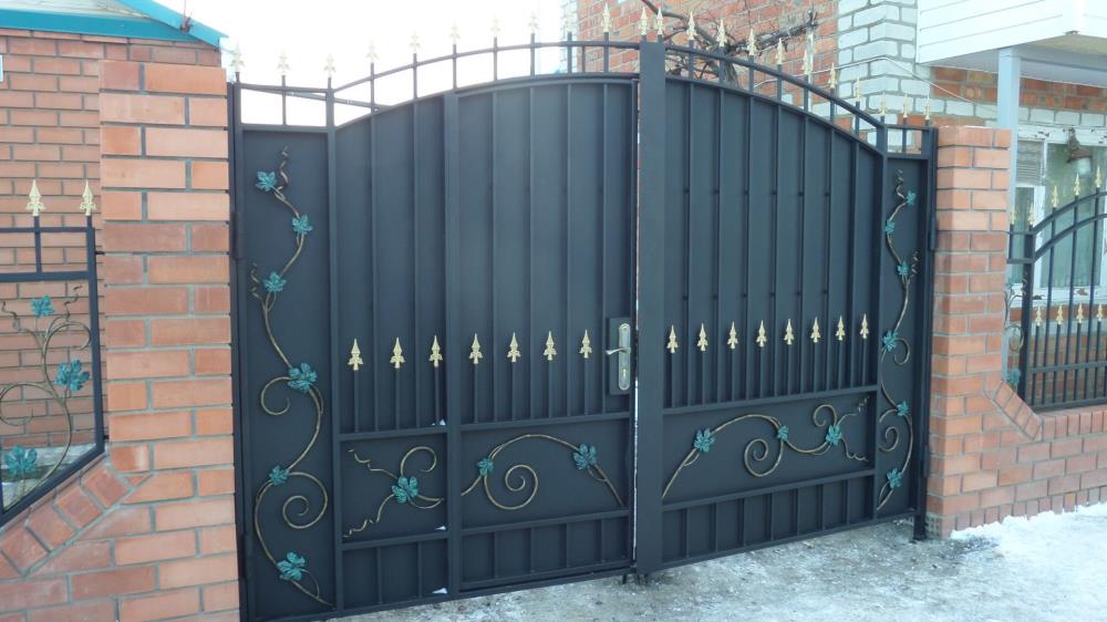 Все составляющие сконструированные для таких ворот обладают прокатанные бортики, которые смотрятся довольно красиво на изделии в сочетании с покраской патиной и выделения законцовок деталей и литых пик.