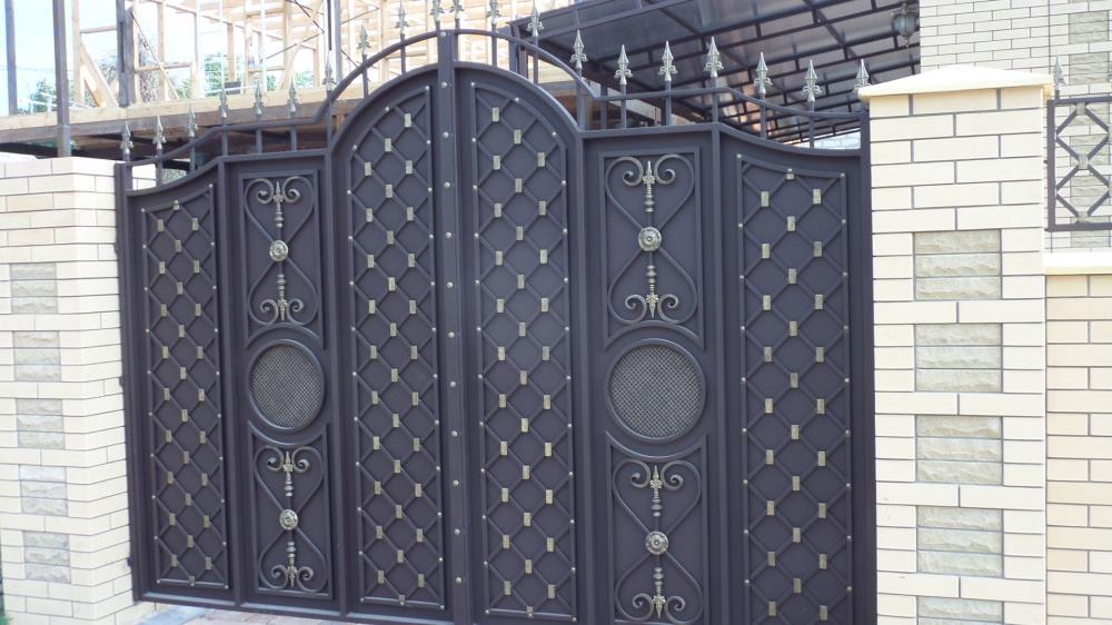 Все составляющие сформированные для таких ворот обладают прокатанные бортики, которые выглядят безмерно красиво на продукте совместно с окрашиванием патиной и выделения законцовок деталей и литых пик.